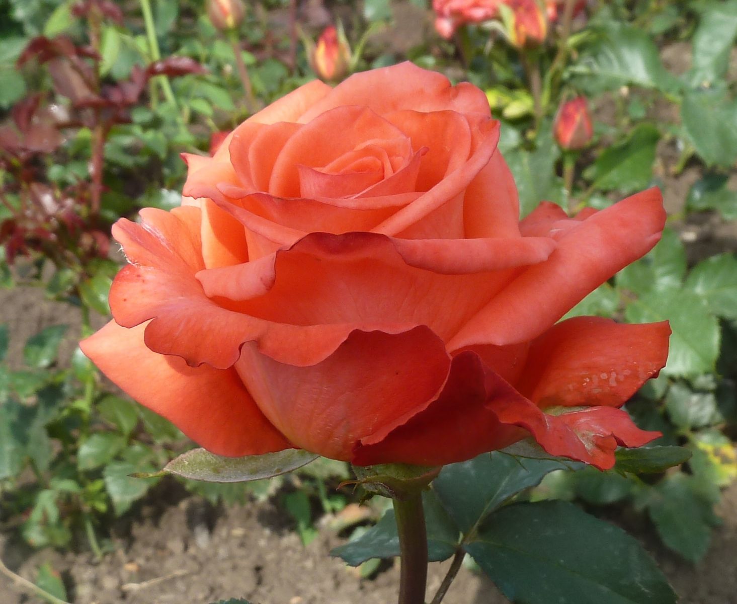 Саженец чайно-гибридной розы Спутник (Sputnik) представляет собой великолепное растение с крупными цветками диаметром 10-12 см, обладающими классической формой бокала. Эти розы выделяются насыщенными оранжево-красными оттенками, которые придают им особую выразительность. Аромат розы Спутник яркий и приятный, что делает её ещё более привлекательной. Цветение продолжается с мая до первых заморозков, практически без перерывов. Кусты средней высоты, достигающие 80-120 см, прямые и компактные. Цветки распускаются на ровных побегах, чаще всего по одному, но иногда могут образовывать небольшие кисти по 3 цветка. Листва зелёная, устойчива к болезням, а лепестки не повреждаются дождём, что позволяет розе выглядеть прекрасно в любую погоду.
